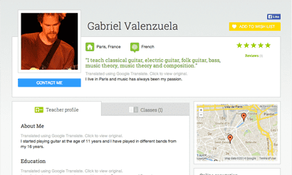 La creación de un perfil en Apprentus es completamente gratis. Haz clic en el botón amarillo "Dar clases particulares" en la parte superior de cada página del sitio y accederás a un formulario donde puedes hacer una lista de las actividades que enseñas, la descripción de tus cursos, el lugar donde prefieres impartirlos y el precio. De esta forma, tus futuros estudiantes te irán conociendo y podrán escogerte según sus intereses específicos.